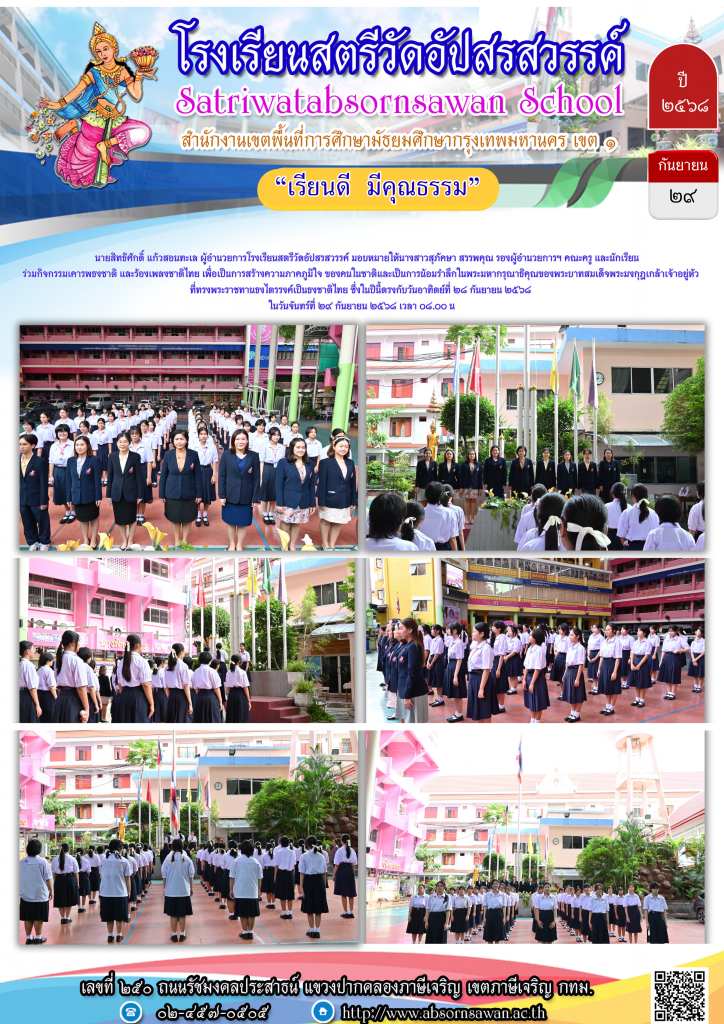 นายสิทธิศักดิ์ แก้วสอนทะเล ผู้อำนวยการโรงเรียนสตรีวัดอัปสรสวรรค์ มอบหมายให้นางสาวสุภัคษา สรรพคุณ รองผู้อำนวยการฯ คณะครู และนักเรียน