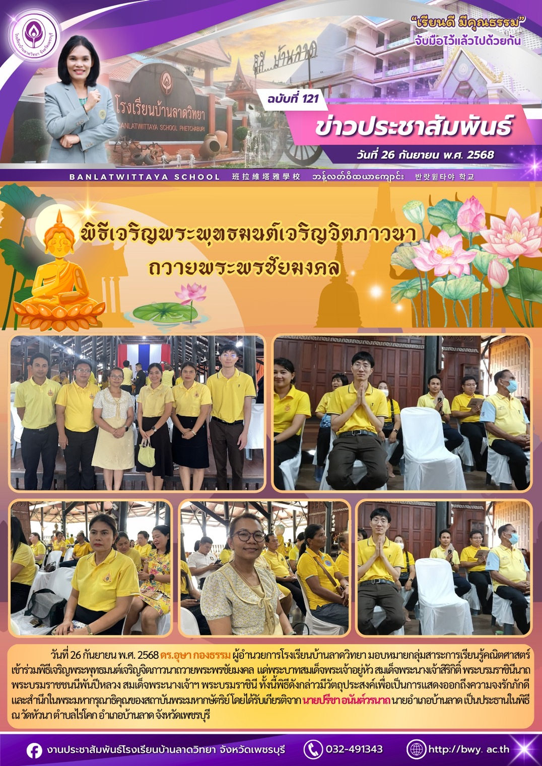 วันที่ 26 กันยายน พ.ศ. 2568 ดร.อุษา กองธรรม ผู้อำนวยการโรงเรียนบ้านลาดวิทยา มอบหมายกลุ่มสาระการเรียนรู้คณิตศาสตร์ เข้าร่วมพิธีเจริญพระพุทธมนต์เจริญจิตภาวนาถวายพระพรชัยมงคล แด่พระบาทสมเด็จพระเจ้าอยู่หัว สมเด็จพระนางเจ้าสิริกิติ์ พระบรมราชินีนาถ พระบรม...
