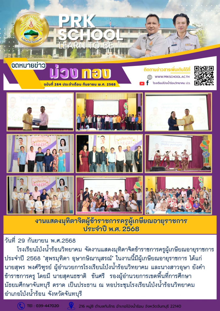 โรงเรียนโป่งน้ำร้อนวิทยาคม จัดงานแสดงมุทิตาจิตข้าราชการครูผู้เกษียณอายุราชการประจำปี 2568 "สุพรมุทิตา อุษากษิณานุสรณ์" ในงานนี้มีผู้เกษียณอายุราชการ ได้แก่นายสุพร พงศ์วิฑูรย์ ผู้อำนวยการโรงเรียนโป่งน้ำร้อนวิทยาคม และนางสาวอุษา ยังคำ ข้าราชการครู โดยมี นายสุคนธชาติ ขันศรี รองผู้อำนวยการเขตพื้นที่การศึกษา มัธยมศึกษาจันทบุรี ตราด เป็นประธาน ณ หอประชุมโรงเรียนโป่งน้ำร้อนวิทยาคมอำเภอโป่งน้ำร้อน จังหวัดจันทบุรี